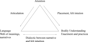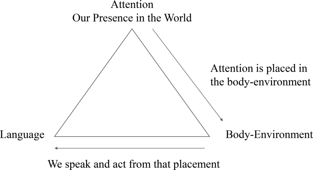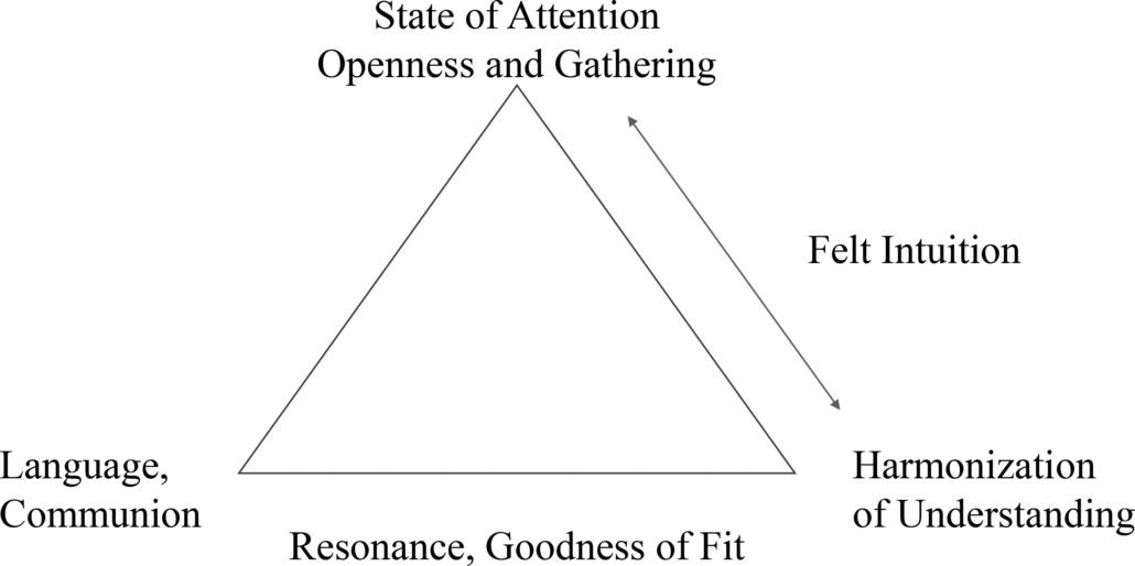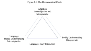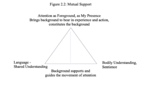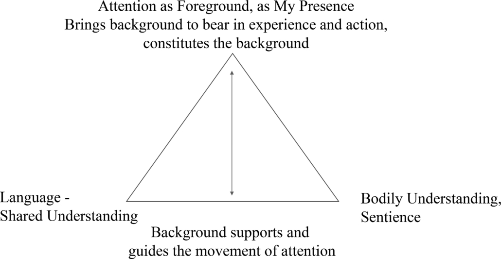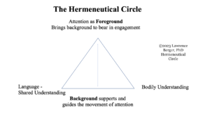 “There is an uncountable number of processes which make up the implicit understanding, which Gendlin refers to as a coordinated or unseparated multiplicity because they “cross” with one another due to how each process interaffects the others depending on the relevance of the occurrence to each.’ … ‘Of particular interest is the sophistication of the implicit understanding, which incorporates a wide variety of possible behaviors and the effect of each on the other in any given situation. ‘ … ‘The implicit understanding implies that a certain event will occur at the center of attention, but whether that indeed occurs depends on body-environmental conditions being suitable for that occurrence.’ –– Draft Chapter 2 The Hermeneutical Circle. Lawrence Berger 2022